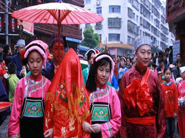 男方的“提親”得到應(yīng)允以后,雙方即開始頻繁往來,加深感情。到了可以談婚論嫁的年齡,便舉行“訂親”儀式。由男方選擇吉日,通知女方做好準(zhǔn)備。那一天,男方家請(qǐng)人抬著用大紅紙封口的一大壇酒、若干塊紅糖、一盤用紅紙包裝的爆竹、一只大公雞,另外還要送彩禮錢若干,其數(shù)量不同時(shí)代、不同地區(qū)有不同的慣例。訂婚儀式后,準(zhǔn)女婿每年給岳父家送一只豬腿、糯米粑及酒等禮物,以示孝敬。