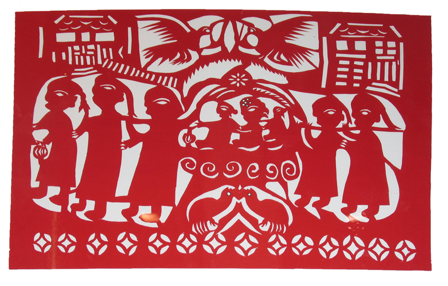 其實,這樣一種民間工藝,早在清代,就已堂而皇之地登上了朝廷大雅之堂。如皇帝舉行婚禮作洞房的神寧宮,墻壁就按滿族習(xí)俗裱紙,四角貼著雙喜字剪紙角花,頂棚中心貼著龍鳳團花剪紙。在宮殿兩旁的過道壁上也貼有角花。據(jù)說有人用紙剪成有鹿、鶴、松的“六合春”圖案,加以彩繪,貼于朝服覲見慈禧太后,連她都以為是繡出來的。