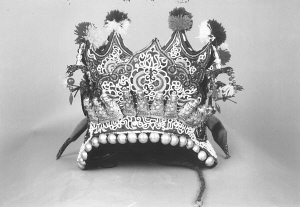 繡花帽由里外兩部分組成,素有“制做繡花帽,先做好襯套”之說。即先按兒童頭徑大小制襯套,做法較簡單,用染過的家織布做里襯,鋪上薄棉,外層為紅綢面,用線依次納緊,以防棉花下滑,縫成筒狀后,頂部用同樣的材料剪成四方形,與上部帽沿結(jié)構(gòu)相同即成。后部分較前部分復(fù)雜,先將染過的兩層家織布粘牢,表面貼上各色緞面,顏色自定。把圖樣拓在緞面上,剪下形狀不同的6片材料,把喜愛的圖案描繪在上面,接著用紡車紡出6根各4米長的棉線,用吊砣逐根旋轉(zhuǎn)纏繞白色呢絨線,經(jīng)濃縮,每根僅得到1米左右線料,將這制好的精線按圖案盤弄,后以花針固定,再輔以其他色線刺繡成圖案點綴其間。把繡好的6片材料組合到襯套上,各片邊沿用黑白兩色線交替鎖邊,帽口用黑金絨布滾邊。此時,帽頂?shù)模吨患饨怯貌噬€制做成圓球裝飾,外面四角下面懸吊白色珍珠串,末端垂著布制五角星。帽的周邊釘上銀制品,最后鑲上反光小圓點飾物似天上星星般光亮,給本就精致美觀的繡花帽增添了一道靚麗色彩,繡花帽就這樣在侗家女的手中誕生了。
