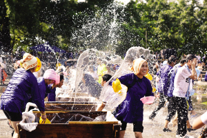 “扁水”是當(dāng)?shù)胤窖?,為戲水、潑水之意?!氨馑笨駳g節(jié)源于侗族“為也”習(xí)俗,為做客之意,指村寨之間村民們的互相訪問,是當(dāng)?shù)匾?guī)模最大的社交和娛樂活動(dòng)?!盀橐病睍r(shí),當(dāng)?shù)囟弊迦罕姂蛩?、潑水狂歡,久而久之就形成了“扁水”狂歡節(jié)。