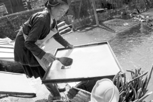 占里村共有182戶827人,這里的侗族古法造紙術源遠流長,全村從事造紙業(yè)的就有170戶,占總戶數(shù)的93%。這里的造紙業(yè)依然保留著原始的家庭作坊和世代傳承的手工制作方式。這種古法造紙技藝以構樹皮為原材料,添加獼猴桃藤、野棉花根,經(jīng)過水浸泡、石灰腌制、蒸煮、碓爛、攤曬、燒堿漂白、打漿、瀝水、抄紙、烤干等72道工序,最終制成白皮紙。