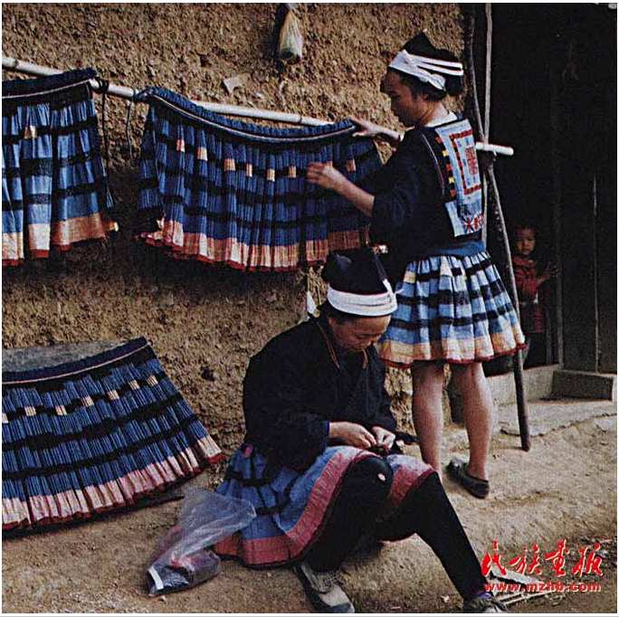 畫好的白布放進(jìn)盛有牛膠和藍(lán)靛的缸里浸染7— 10天,當(dāng)布匹染成深藍(lán)色時(shí)拿出,再放入盛有草木灰的熱水中,用灰水將粘膏脫去,清水洗凈后晾干,就成了一塊有白色花紋的蠟染布。白褲瑤婦女在白色的花紋上繡上彩色的絲線,再把三幅繡有圖案的布連成一塊4米長(zhǎng)的裙布,在裙腳邊上縫上一條手掌寬的黃色蠶絲,最后用2 條棉繩穿過裙頭勒緊,百褶裙就做成了。一條百褶裙從紡線到完成據(jù)說需要兩到三年的時(shí)間。