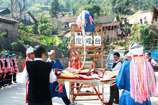 “度戒”臺(tái)(俗稱“巫臺(tái)”,亦稱“神臺(tái)”或“五臺(tái)山”)設(shè)在村子下面的一塊小地里,因這次有兩人“度戒”,便并列設(shè)了兩個(gè)“巫臺(tái)”?!拔着_(tái)”搭得較簡(jiǎn)單,先在場(chǎng)地上打4棵木樁,用四方桌作臺(tái)頂,桌子的4腳分別捆在木樁上,臺(tái)高約4米;“巫臺(tái)”前搭有一架有5個(gè)臺(tái)階的木梯,等“度戒”者送上臺(tái)后便把木梯砍掉;臺(tái)后有一張用大青藤編成的狀如蛛網(wǎng)的大網(wǎng),上面鋪著幾床新被子,約有10人對(duì)稱拉開,等“度戒”師下令,“度戒”者從“巫臺(tái)”上仰面滾落下來。拉網(wǎng)的人乘“度戒”者墜落進(jìn)網(wǎng)之勢(shì),把他輕放于地上,并將手中之繩速向?qū)Ψ綊仈n,“度戒”師看了其落地的姿勢(shì)可以,此次“度戒”便算成功了。