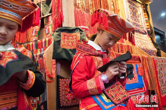 12月6日,在中國瑤族之鄉(xiāng)廣西金秀瑤族自治縣的盤王節(jié)上,當(dāng)?shù)乩弦惠叕幾鍕D女展示瑤族織繡