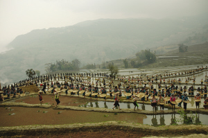 上午10點(diǎn),由上千名當(dāng)?shù)毓嶙遛r(nóng)民和彝族農(nóng)民組成的表演團(tuán)隊,在20平方公里之廣袤的梯田間開始載歌載舞,展現(xiàn)當(dāng)?shù)氐纳贁?shù)民族放牛、插秧、抓魚、婚禮等生產(chǎn)生活方式。梯田、森林、村莊、河流在1小時的演出中渾然一體,征服了當(dāng)?shù)厝罕姾蜕锨型庥慰汀?/p>