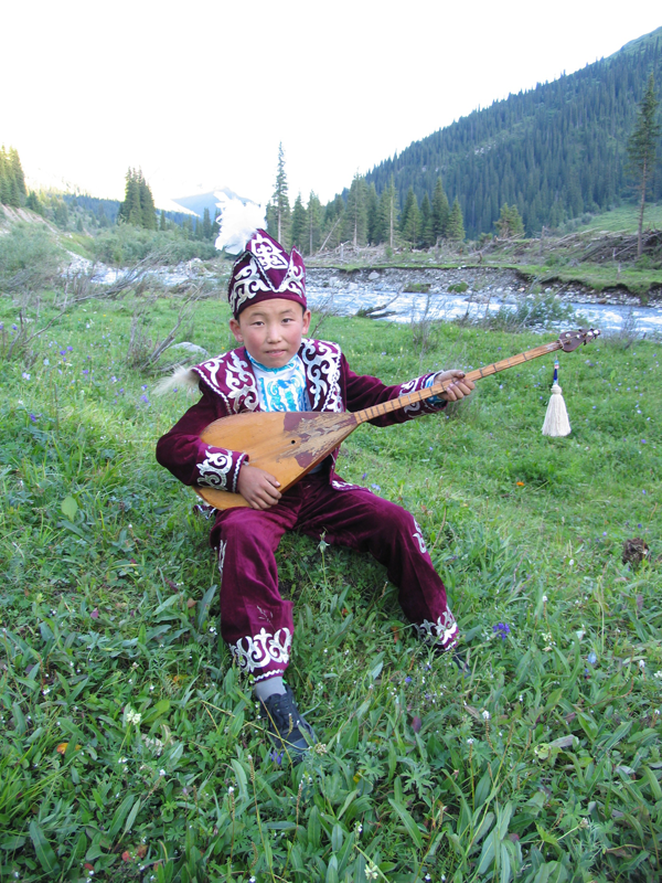 哈薩克族的音樂極具民族特色,樂器種類和樂曲形式也非常豐富。“冬不拉”為彈奏樂器,是哈薩克族民間最流行的傳統(tǒng)樂器,分為高、中、低等十幾種。冬不拉易學(xué)易帶,深受廣大哈薩克族人民的喜愛。拉奏樂器以“柯布孜”為代表,演奏起來聲音類似小提琴,但形狀要比小提琴復(fù)雜,其上端向里彎,琴腹如勺,腹面張開,背面蒙有羊皮,琴弦是用馬尾或牛筋制做而成的。吹奏樂器主要有“斯伯孜俄”,民間藝人喜好并擅長使用此物,被哈薩克族譽為“心笛”。這種樂器外形酷似豎簫,音色悠揚而柔和。哈薩克族的打擊樂器也有很多,極有特色的是“阿迪托亞克”。這種打擊樂器由兩個組成一對,演奏時互相擊打,其外形似馬蹄,加之所奏出的效果也像馬蹄踩在地面上的聲音,哈薩克族稱之為“馬蹄音”。
