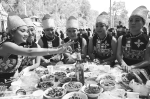 “鳥頭節(jié)”是花腰傣的傳統(tǒng)節(jié)日,村民們通過傳統(tǒng)的祭祀方式,祈求神鳥保佑村寨平安吉祥,來年五谷豐登?,F(xiàn)在“鳥頭節(jié)”已注入了輕松、歡快的內(nèi)容。宴席上,大家將鳥頭用木棍插好放在酒瓶中,輪流彈動鳥頭,鳥嘴指向誰,表示誰的運(yùn)氣好,就要喝下一杯酒。這樣飽含祝福、喜慶的勸酒習(xí)俗,為節(jié)日增添了樂趣。圖為花腰傣姑娘們彈動鳥頭喝酒。