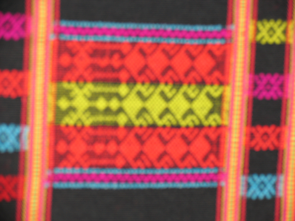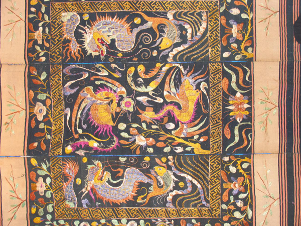從龍被的圖案中,我們可以辨別出它是屬于哪個(gè)年代的作品。早期的圖案多為人形紋和鬼紋(人的靈魂),這兩種圖案實(shí)際上都是一樣的,是由色彩的明暗來(lái)區(qū)分的,明的是人形紋,暗的是鬼紋。后來(lái)的龍被,因受漢族文化的影響,圖案也逐漸漢化了。因此,后期的龍被,織物和部分圖案保留黎族文化,而刺繡的花紋圖案都是漢文化的。