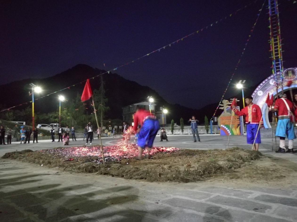上刀山、下火海,是傈僳族民間的傳統(tǒng)民俗活動,是其傳統(tǒng)節(jié)日“刀桿節(jié)”上的主要表演項目。傈僳族的“刀桿節(jié)”源于一種原始的宗教活動。早期在“刀桿節(jié)”上表演上刀山、下火海的勇士們,都得聽命于巫師。上刀山、下火海之前,有一套繁瑣的宗教祭祀儀式。而且每個上刀山、下火海的勇士身上都要掛上幾十條巫師畫的符咒,使這一活動蒙上了濃厚的宗教色彩。經(jīng)過改革的傈僳族的“刀桿節(jié)”,一般于每年二月初八舉行,屆時,上刀山、下火海就是表演的重要內(nèi)容。上刀山之前,人們首先豎起兩根20 多米長的筆直的松樹桿。在樹桿之間順序捆上36 或72 把鋒利的刀刃向上的鋼刀作梯子。表演開始后,表演者赤手光腳,蹬上梯子頂端,并要做些“蜻蜓倒立”“飛燕迎春”等高難動作。下了刀桿后,勇士們還要赤裸著上身、光著腳跳入熊熊烈火中,甚至用身體滾壓火海,直至炭火逐漸熄滅為止。此后,群眾性的娛樂活動就開始了,唱歌跳舞,呈現(xiàn)出節(jié)日的歡樂氣氛。上刀山、下火海,是經(jīng)過表演者長期的武術和氣功訓練才能完成的。這一活動也表現(xiàn)出傈僳族人民機智、勇敢、知難而進的優(yōu)良品質(zhì)。