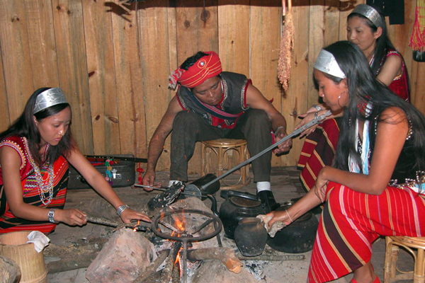 嚼檳榔是佤族男女老少普遍的嗜好,平時(shí)勞動(dòng)休息或閑談,口中都嚼一塊檳榔。所嚼檳榔都是用麻櫟葉和石灰煮成的代用品,據(jù)稱嚼檳榔有健齒作用。