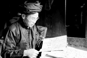貴州省榕江縣水尾水族鄉(xiāng)水盆村地處月亮山深處,與外界接觸少。目前,該村村民仍穿水族服裝,講水族語言。該村有169戶共796人,水書先生有10人。他們保存水書1000余冊,其中, 有成書50年以上的水書300余冊。圖為水書先生王明先在向人們展示水書。