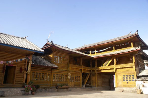 納西族的民居在民國(guó)時(shí)期普遍呈“用圓木縱橫相架,層面高至七、八尺,即加椽行,覆之以板,石壓其上”的“木楞房”形制。通常的情況是,在木楞房的正房(祖房)納西族稱為“吉美”(意為母房)中,有一個(gè)納西語(yǔ)稱為“格古魯”的高出地面的灶臺(tái),有家神供其上。中間為火塘,安置大型鑄鐵制三腳架于其上,用以燒水、做飯和取暖。會(huì)客、聚餐和老人就寢都會(huì)在中間的灶臺(tái)上。這種普遍的房屋式樣以及室內(nèi)設(shè)置在廣大山區(qū)和香格里拉三壩、寧蒗永寧目前還普遍流行,當(dāng)然現(xiàn)在的房子已經(jīng)比以前高大寬敞了許多。