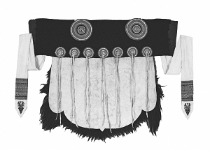 剪裁時(shí),將羊皮修剪成U型,上部橫鑲一段黑氆氌(毛織品)或黑呢子,內(nèi)襯天藍(lán)色棉布。其下用七對(duì)白色鹿皮條穗縫綴并列的七個(gè)小圓形彩線繡花布盤,肩部縫綴兩個(gè)大圓形彩線繡花布盤。羊皮上端縫釘兩條繡花白布長帶,帶端還繡有花鳥、魚蟲、動(dòng)物、植物、幾何等圖案,據(jù)說是象征納西族人民如蜂似蝶地奔忙,以辛勤勞動(dòng)換取甜蜜生活。