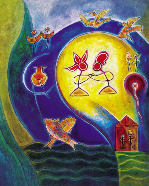 作品以東巴象形文字“男女相擁”符號(hào)為主,還以“雙魚、心、男女起舞、家”等與愛情相符號(hào)組成畫面