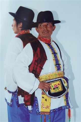土族的服飾具有獨特的民族風格,青壯年男子,戴有綿鑲邊的氈帽,也有的戴“鷹嘴啄食”的氈帽,身穿小領,斜襟、袖口鑲有黑邊胸前鑲一塊四寸方塊的彩色圖案的長袍,還穿繡花高領的白色短褂,外套黑色或紫紅色的坎肩,腰系繡花長帶,穿大襠褲,系兩頭繡花的長褲帶和花圍肚,小腿扎“黑虎下山”(上黑下白)的綁腿帶,穿花云子鞋。老年人一般頭戴黑色的卷邊氈帽,穿小領、斜襟長袍,外套黑色坎肩,系黑色腰帶,腳穿白襪黑鞋。