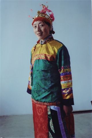 女子結婚或在節(jié)日期間的穿戴更為別致,身穿以綢緞縫制的兩袖口寬的繡花褂子,袖口鑲有七道或九道花邊,花邊上繡有各種花卉圖案,做工精細,鮮亮多彩。頭戴鳳冠,土族語叫“首帕冠”,鑲著瑪瑙和珊瑚,前沿密墜細小的珍珠穗子,中間是細銀絲制成的鳳凰。戴鳳冠時還需要綴假發(fā)誓,并用長簪加固。佩戴這種頭飾,土族語叫“素不都腦達”(即索卡斗?扭達爾之音轉)。