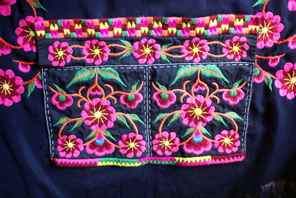 羌族傳統(tǒng)的民間工藝美術以挑花、刺繡最為出色。羌族姑娘從小就學習針線活,成年后都是女紅好手。刺繡時,無需草圖或畫線,心靈手巧的羌族婦女信手能刺繡成絢麗多彩的成品。挑繡時,以布的橫豎方格線為基準,采用挑、纖、扎、繡、勾、納、提、拼、扣等技法,單用或幾種并用,挑繡出來的幾乎都是栩栩如生的植物花卉、波浪等圖案。挑繡常用了頭帕、衣、褲、腰帶、鞋等易磨損處,既美觀又實用。一般煙荷包會繡兩種圖案,鴛鴦戲水和比翼雙飛,意在祈求男女雙方恩愛和諧。