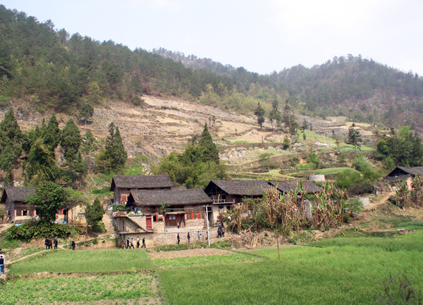 毛南族的村落多依山而立,少占耕地。干欄群落是毛南族村莊的一種布局,但形式不拘一格,根據(jù)地形特點而富有變化。有的從山腰往下建成輻射式群落,即幾座房子前后用“天橋”串聯(lián)起來,組成串聯(lián)式干欄群,這是同一宗族兄弟常采用的一種方式。有的則建立并聯(lián)式群落,即由若干間干欄房子排成兩行,中間留一條通道,兩端置圍墻與院門,圍成長形院落。也有從實際地形出,把房屋排成梯級式干欄群或擺成一字長蛇形的。此外,有的在幾座并排的房子中間開通方便門,以利叔伯兄弟及鄰里串門聯(lián)系,相互關(guān)照,形成一種向心力。村中巷道皆用石板鋪就。村邊興種竹木擋風(fēng),綠化美化環(huán)境。村頭奇特的大樹被視為村、峒守護(hù)神樹,神圣不可冒犯,一旦遇有瘟疫等異常事件,病家抑或全村皆到大樹下祭神禳解。各村屯的村背面都有大片護(hù)村林,既防石頭滾落,又美化村景,此林不允許隨意砍伐。同時,自然屯大都設(shè)立集體活動場所,在水井、溪邊、道旁或大樹下擺放石凳,供人們節(jié)日及閑暇時間聚會、娛樂。