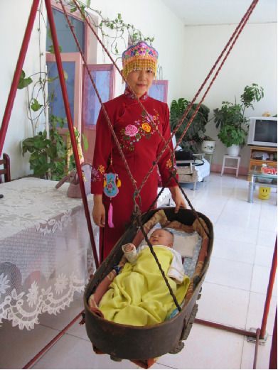 錫伯族的誕生禮在人生諸禮中占有重要位置,而且持續(xù)時(shí)間也比較長,包括產(chǎn)前的求子習(xí)俗、孕期習(xí)俗,以及分娩習(xí)俗和子女養(yǎng)育習(xí)俗。為慶賀孩子的出生,要為他(她)舉行嬰兒祝吉禮,主要包括起名禮、滿月禮、周歲禮。男女新生兒的誕生儀式有所差異。傳統(tǒng)觀念認(rèn)為生男是“弄璋”之喜,表示尊貴,要大慶賀;生女為“弄瓦”之喜,表示卑順,儀式從簡。