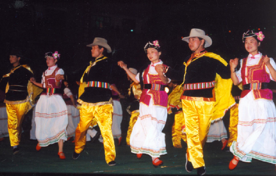 普米族的民間娛樂舞蹈,普遍具有歌、舞、樂三位一體的特點。舞蹈形式正如普米族民歌所唱的:“如金線把珍珠穿成一串,手拉手跳成十五的月亮?!眾蕵肺璧溉鞘掷洲D(zhuǎn)圓圈的舞蹈形式。人們挽手而跳,伴以高亢洪亮、情感激越的唱詞。特別是普米族婦女雪白的長裙隨舞步輕盈飄旋,似白鷺翻飛,正如《打跳歌》中所唱的:“笛聲不停莫歇腳,舞場上沒有陡巖子,腳底板下沒有刺,跳它個地動山也搖?!痹谙矐c的集會之夜,歡快的娛樂性舞蹈,往往一跳就是通宵達(dá)旦。跳鍋莊是普米族傳統(tǒng)的舞跳形式,這種舞蹈不受時間空間的限制,只要一支竹笛或葫蘆笙,有一塊空地即可進行,少則三五人,多則數(shù)百人。一般總是在傍晚,在院內(nèi)或場壩上舉行。跳舞時,總要在中間燃起一堆火,與室內(nèi)的鍋莊相似,所以稱之為鍋莊舞。鍋樁內(nèi)容很豐富,從古代的游牧、狩獵、紡織到今天的趕街、慶豐收、烤酒等都有反映。流行的曲調(diào)有《放單調(diào)》《出山》《獅子舞》等等。現(xiàn)在,鍋莊舞已發(fā)展成為集唱詞、曲調(diào)、舞蹈、音樂于一體的綜合性歌舞藝術(shù)。