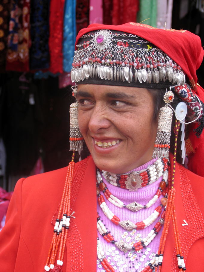 塔吉克族婦女服飾的顏色艷麗而奪目,大多數(shù)會以紅色為主,她們喜歡穿連衣裙,并在裙邊、領(lǐng)口、袖口上繡以美麗的花紋或者圖案,還喜歡用耳環(huán)、項(xiàng)鏈、手鐲等首飾來裝扮自己。她們十分講究頭飾和帽子,有一種青年婦女的圓形花帽上會嵌鑲金、銀片和各種珠子,帽子前沿會裝飾一排色彩鮮麗的珠子、銀鏈。婦女著裝時(shí)帽沿上會加綴一排小銀鏈,在塔吉克語中稱為“斯拉斯拉”,戴著大耳環(huán),脖子山會繞數(shù)道項(xiàng)鏈,胸前還會佩戴被稱為“阿勒卡”的圓形大頭飾。通常情況下,已婚婦女會在發(fā)辮上綴飾白紐扣,新娘也會在發(fā)辮上飾以絲穗,以求美觀。在塔什庫爾干,打扮得花枝招展的塔吉克婦女隨處可見,猶如從天上云彩中下凡的仙女。塔吉克族已婚婦女的裝束也十分吸人眼球,她們外出時(shí),會在帽子外披上頭巾,迎風(fēng)走來,頭巾隨風(fēng)飄揚(yáng),別有一番風(fēng)度。