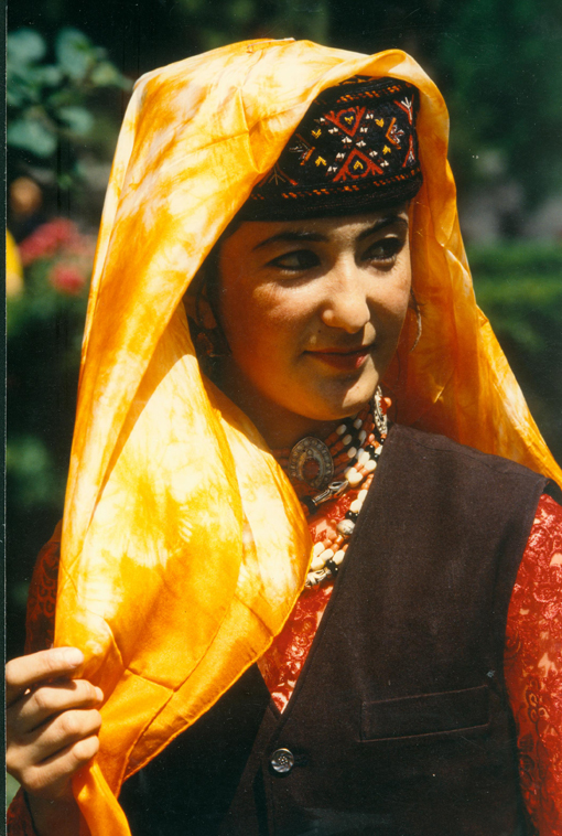 塔吉克族的服飾以帽子最具特色,男子一般戴黑絨、圓形、高統(tǒng)帽。女子一般戴帶圓頂、繡花棉帽,帽子的后半部垂有后簾,出門時(shí),帽子外可以加披方頭巾,一般多為白色,新娘通常會選擇紅色,小姑娘有時(shí)候用黃色。