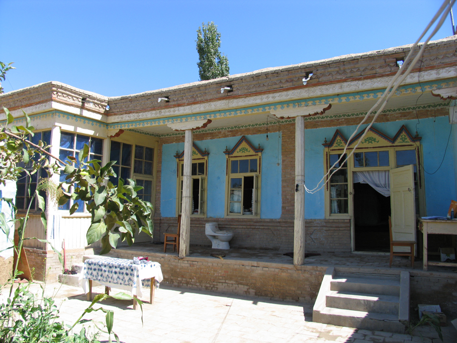 土房的墻一般都很厚,里面粉刷石灰,有的還掛壁毯。墻壁多用石灰刷成淡藍(lán)色,安雙層玻璃窗,內(nèi)層為活動(dòng)式,夏天可以取下,窗外有木屜子,起保護(hù)作用。窗戶上還開有小孔,以便通風(fēng)。房?jī)?nèi)的地面為水泥或磚面。室內(nèi)除有的搭火炕外,其它的裝飾和木房的一樣。不論哪個(gè)房間,都可作為臥室,也用于待客,廚房和儲(chǔ)藏室單建,有的還單建馕坑。