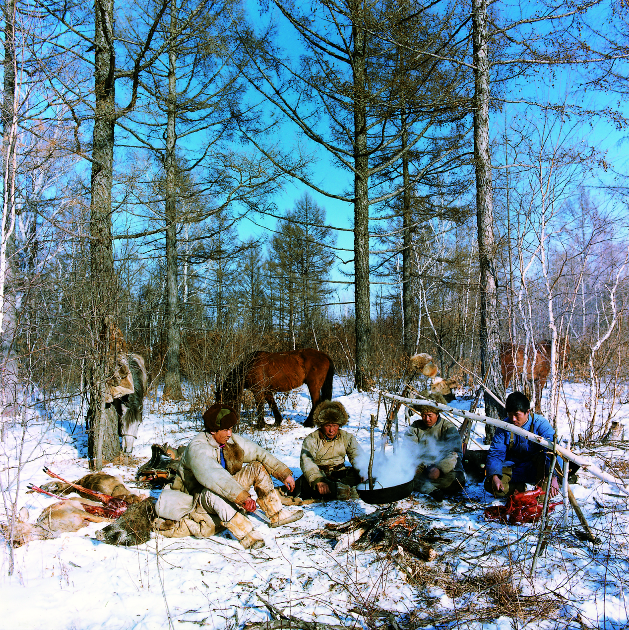 “烏勒倫”(煮肉,即手抓肉)、“達拉嘎蘭”,(燒肉)、“席拉蘭”(烤肉)、“枯胡熱”(熟肉干)、“烏爾嘎塔”(生肉干)是主要食用方法。他們一直保留著食生習(xí)慣,所謂食生,主要是指狍子的腎臟(俗稱腰子)和肝臟,據(jù)說狍腰子可以補腎強身,狍肝可以清火明目?!鞍⑺亍笔菍⒅笫斓尼箢^肉、心肺、里脊切成細絲或小丁塊,拌上野豬油、熟狍腦和野蔥花、鹽等佐料,看上去像西餐中的“沙拉”,可以直接食用,也可以回鍋炒一下再吃?!安加蜕?,即血腸,讓大型動物的膛血沉淀后將白色的血清和紅色的血液分離,加佐料分別灌入兩根腸衣中,煮熟后紅白分明,味道亦各具特色。