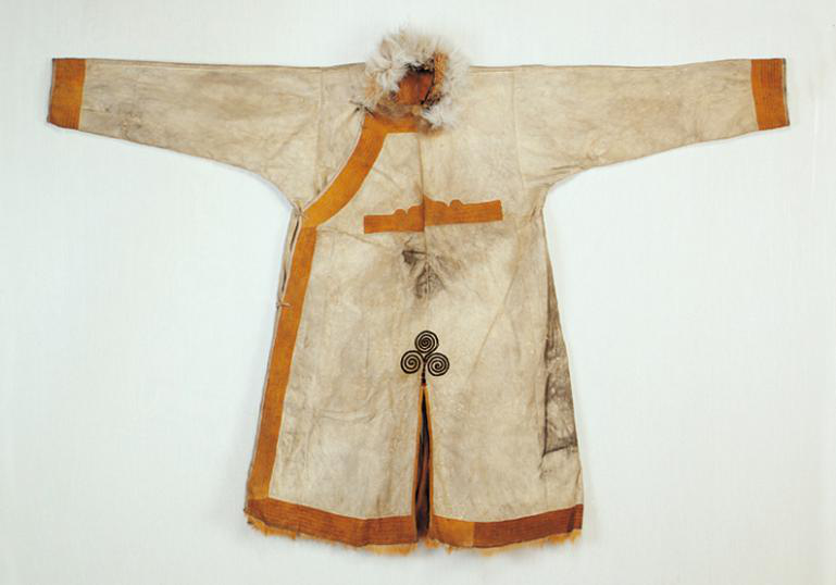 縫制衣服的針最初都是骨和木制的,將狍子的小腿骨加工成細(xì)骨簽,再在石頭上磨成骨針。據(jù)說(shuō)用落葉松的心木做成的針比骨針還硬??p制厚皮衣物時(shí),比如上鞋底,骨針和木針都扎不動(dòng),他們又用狍角制成角錐。頂針也是用獸骨制作的,鄂倫春族婦女縫制衣服時(shí)不像漢族那樣將頂針戴在中指上,拉線(xiàn)的時(shí)候針尖朝外。她們是將頂針戴在食指上,拉線(xiàn)的時(shí)候讓針尖朝自己,為的是避免扎到別人。獸皮服裝必須要用獸筋線(xiàn)縫紉。把涼干了的狍、鹿和犴筋,用木錘砸成綿軟的纖維,在搓成細(xì)細(xì)的線(xiàn)就可以使用了。用獸筋線(xiàn)縫紉的皮衣褲,即使剮壞了、磨爛了,卻始終不存在開(kāi)線(xiàn)的問(wèn)題(上圖為鄂倫春傳統(tǒng)服裝——狍皮袍,劉軍供圖)。
