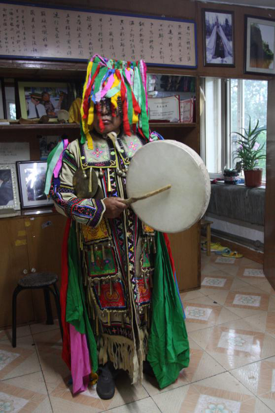 冬天穿的鞋是“奇哈密”和“溫得”,“奇哈密”是用狍脖皮或犴皮做靴底,用狍腿皮拼縫成靿的短靴?!皽氐谩笔怯寐够蜥砥ぷ龅?,鹿或犴腿皮拼縫成靿的長(zhǎng)靴?!皽氐谩币?yàn)殪壐?,冬天穿著打獵不易灌雪。這兩種靴子都要用冬季絨毛狍皮做成的襪子配套穿用,暖和跟腳,踩在雪地上沒(méi)有聲響。夏天一般穿“奧勞其”,是一種皮底布靿短靴。“考呼落”,是用冬季絨毛狍皮縫制的二指手套,掌面腕部留一縫口,手從縫口中伸出,手套仍護(hù)在手背上,既使在零下40度的嚴(yán)寒中處理獵物,也不用擔(dān)心手被凍壞。還有一種五指狍皮手套,背面正中繡花、蝶等中心圖案,五指的關(guān)節(jié)和指甲處繡出各種小型圖案,然后用連理枝將中心圖案和關(guān)節(jié)、指甲圖案連為一體,中心圖案代表手掌,手指圖案代表關(guān)節(jié)和指甲,連理枝代表骨骼和血脈(圖為越來(lái)越鮮見(jiàn)的薩滿(mǎn)服飾,吳雅芝供圖)。