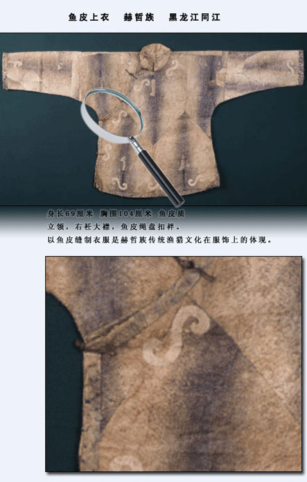 赫哲族的魚皮衣歷史久遠。我國古代文獻《山海經(jīng)》第九卷《海外東經(jīng)》中便有“玄股之國,在其(黑齒)北,其為人衣魚食鷗” 的記載?!耙卖~”西晉學者郭璞解釋為“以魚皮為衣也?!闭f明早在兩千多年前,赫哲族的先民就已使用魚皮做衣服了。另據(jù)密山新開流新石器時代遺址中出土的魚叉及骨針,證明赫哲族的先民捕魚和縫制魚皮衣有數(shù)千年歷史了。清代張晉彥的《寧古塔山水記》有:“魚皮部落,食魚為生,不種五谷,以魚皮為衣,暖如牛皮”的記載。《皇清職貢圖》記載:“赫哲衣服多用魚皮而緣以色布,邊綴銅鈴,亦與鎧甲相似?!绷硗?,地方志書對此也多有記載。可見,赫哲族制作和穿著魚皮衣是真實而久遠的。