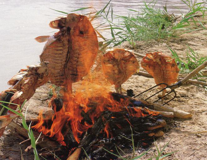 赫哲族居住的三江流域,河流縱橫交錯(cuò),群山環(huán)繞,蘊(yùn)藏著極為豐富的漁獵資源。長(zhǎng)期以漁獵為生的赫哲族人民,在征服自然、改造自然的歷史發(fā)展過(guò)程中形成了具有濃郁民族特色和地域特色的傳統(tǒng)飲食文化。其傳統(tǒng)飲食以漁獵產(chǎn)品為主,魚干獸肉,家家堆積為糧。這與農(nóng)牧民族相比,別具特色。