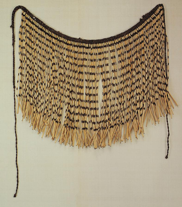 博嘎?tīng)枊D女穿一種叫“基都”的短上衣。用野麻織成的土布縫制,其樣式為無(wú)領(lǐng)、短袖、對(duì)襟。下部穿用羊毛織成的粗呢緊身筒裙,稱作“結(jié)邦”。小腿部扎裹腿,叫“涅蘇木”。條件好的人家外面還會(huì)罩一件稱為“階納布”的披肩。希蒙部落的婦女穿當(dāng)?shù)孛藁棾傻陌咨蛩{(lán)色的寬大對(duì)襟短上衣。下身穿筒裙,裙子下擺較寬,上面織有黃紅色或黃黑色的簡(jiǎn)單圖案(圖為民國(guó)時(shí)期的珞巴族草裙,中央民族大學(xué)民族博物館館藏)。