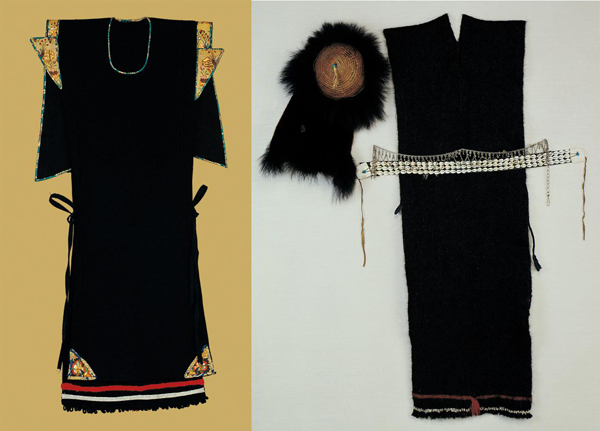 珞巴族的民族服飾已列入國(guó)家級(jí)非物質(zhì)文化遺產(chǎn)名錄。圖為珞巴族民國(guó)時(shí)期貫頭式氌氌女服與男服,中央民族大學(xué)民族博物館館藏。