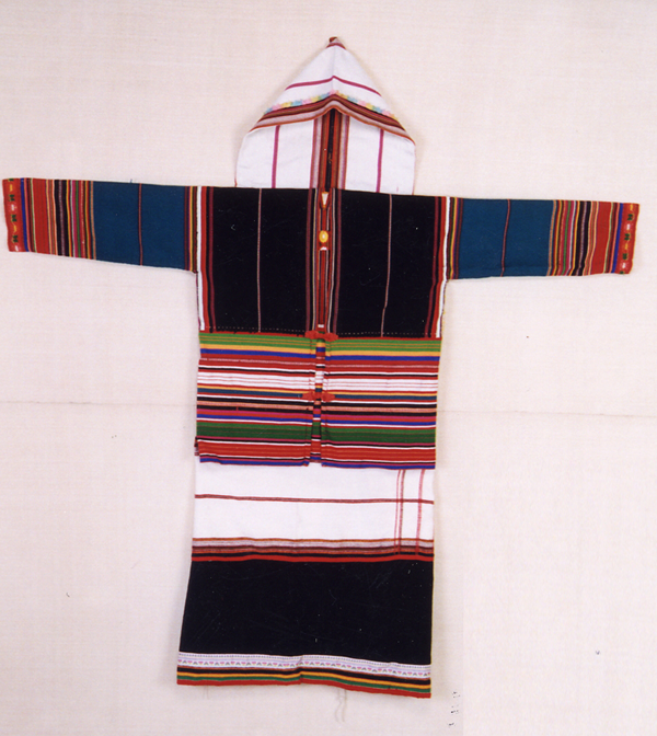 基諾族婦女上衣為無(wú)領(lǐng)對(duì)開,上半部多采用黑布或白布,下半部及衣袖用紅、藍(lán)、黃、白等7色布配制或刺繡而成,用紅色鑲邊,上衣背部縫一塊約3寸見方的白布,上面繡有圓形太陽(yáng)花式圖案(基諾族稱月亮花);內(nèi)衣為上部呈方形下呈菱形的兜肚式緊身衣,上部方形為鮮艷的條飾花紋,下部菱形繡著各式圖案。下身多著紅色鑲邊的黑色合縫短裙,并用一尺左右的黑布纏綁小腿。發(fā)型為椎髻,婚前髻在腦后右方,婚后髻在前額正中。頭戴披風(fēng)式尖帽,這種尖帽用長(zhǎng)約60公分、寬23公分的豎線花紋土布對(duì)折,縫住其一邊而成,戴時(shí)又在帽沿上折起一指許的一道邊。