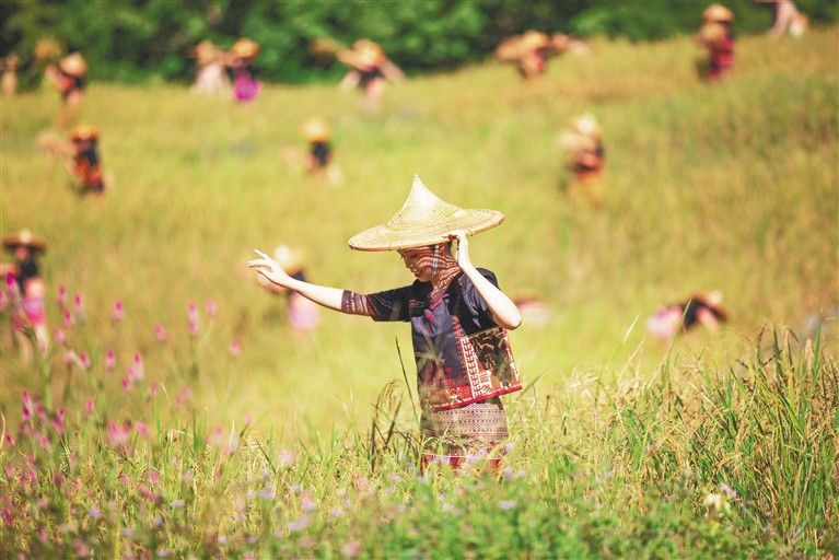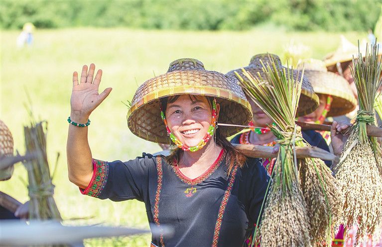 “砍山種植山蘭稻,一定要成功,煮好山蘭米,釀好山蘭酒,邀來親朋與好友,同慶好豐收……”當(dāng)天,在位于霸王嶺下的青松鄉(xiāng)擁處村的山坡上,一串串飽滿的稻穗已壓彎了稻稈;此時(shí),農(nóng)戶們?nèi)褰Y(jié)伴爬上山坡,弓下腰身麻利地?fù)]動(dòng)著手中的鉤刀開割稻稈,在辛勤勞作之時(shí),還不忘哼起黎族歌謠分享著又是一年山蘭好收成的喜悅。山坡上辛勤勞作的喜悅,與正在山腳下舉辦的“啦奧門”山蘭文化節(jié)的喜慶氛圍達(dá)成了同一節(jié)拍。