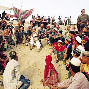 2004年6月,和田市和田縣庫克馬日暮麻扎,民間藝人在表演說唱