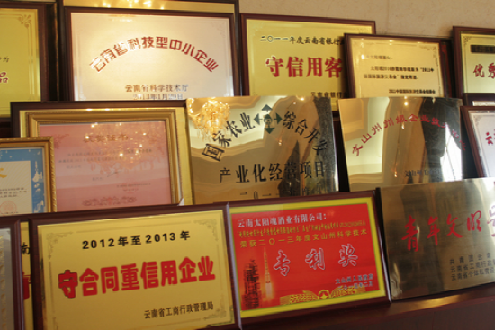 十幾年的風(fēng)雨兼程,太陽魂酒業(yè)有限公司榮膺多項殊榮,先后獲得“云南省農(nóng)業(yè)產(chǎn)業(yè)化省級龍頭企業(yè)”、“云南省農(nóng)產(chǎn)品加工重點企業(yè)”、“全國休閑農(nóng)業(yè)與鄉(xiāng)村旅游示范點”、“云南省著名商標(biāo)”、“云南省省級企業(yè)技術(shù)中心”、“2009中國(昆明)酒業(yè)發(fā)展高峰論壇暨新中國60周年云南酒業(yè)十大功勛品牌”及“云南酒類消費市場十大最具成長性品牌”、“云南省接待用酒”等榮譽稱號。已獲得QS認(rèn)證、ISO9001認(rèn)證,HACCP認(rèn)證等高標(biāo)準(zhǔn)企業(yè)資格證書。產(chǎn)品質(zhì)量達(dá)到國內(nèi)先進(jìn)水平,釀制的“赤霞珠”葡萄酒獲2006年亞洲葡萄酒質(zhì)量大賽金獎、北京國際葡萄酒暨烈酒挑戰(zhàn)賽銅獎和第八屆中國國際葡萄酒及烈酒評酒會上榮獲銀獎,梅里圣地冰酒榮獲2006年亞洲葡萄酒大賽銀獎、2012年亞洲質(zhì)量大賽金獎及領(lǐng)袖產(chǎn)區(qū)代表產(chǎn)品。朗姆酒2011年榮獲“2011中國(蓬萊)國際葡萄酒?烈酒品評賽”銀獎。2011年國際釀酒師葡萄酒烈酒大賽中獲得銀獎,2012年獲得國際釀酒師葡萄酒烈酒大賽金獎。2012年,公司釀造的赤霞珠產(chǎn)品被法國勃艮第大學(xué)葡萄酒學(xué)院指定為教學(xué)用酒。2013年7月,“梅里圣地赤霞珠冰酒”榮獲2013中國優(yōu)質(zhì)葡萄酒挑戰(zhàn)賽金獎。同時,公司位于德欽產(chǎn)區(qū)的干紅及冰酒已通過有機產(chǎn)品認(rèn)證。2014年“2012梅里冰酒”榮獲國際領(lǐng)袖產(chǎn)葡萄酒(中國)質(zhì)量大賽優(yōu)質(zhì)獎,拍品價格1萬元。