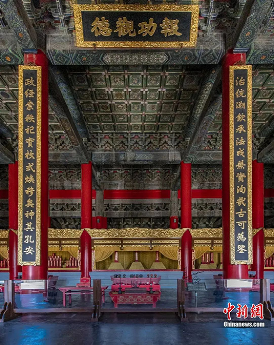 歷代帝王廟景德崇圣殿內景匾額與楹聯。(中新社發(fā) 許偉 供圖)
