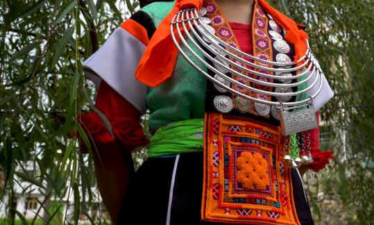 谷灑村女子服飾以短袖開衫服飾為主,短袖開衫服飾以綠色、橘黃色為主。谷灑村苗族背牌苗正是因為女子服飾上背牌而得名。在女子服飾,短袖開衫上必不可少的是背牌苗的背牌,背牌分為兩扇,后背牌較大,圖案以方形和字體為主。在前背牌系帶上同樣繡有圖案。背牌不僅是由刺繡圖案而成,還有銀飾。在背牌及系帶鑲嵌銀泡花。銀飾銀圈,銀圈的多少往往與女子家境有關。