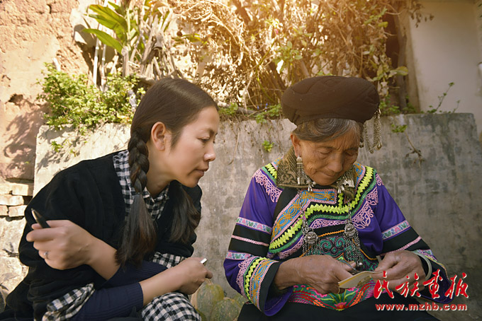 盧潔瑩下鄉(xiāng)向彝族老前輩請(qǐng)教彝繡圖案樣式(索玉文化美學(xué)創(chuàng)意有限公司 供圖)