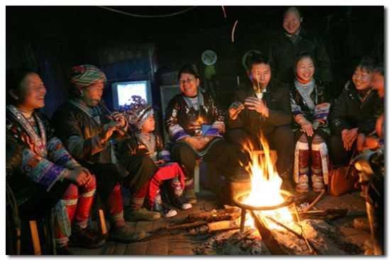 苗族起木樓很注重火塘的設置,特別留出二樓正中的大半廂作火塘。火塘用寬厚老杉木板鑲制成一個長寬約一點五米,深約六十公分的正方形木槽,槽內(nèi)用粘性強的黃泥巴填滿舂緊,正中央安放有三腳鐵架,用于架鍋煮食。火塘是煮食、進餐、取暖、會客、議事、祭祀的地方,又是年輕人走妹行歌、談情說愛、舉行婚禮儀式的場所。因此苗家人對火塘是十分看重的。