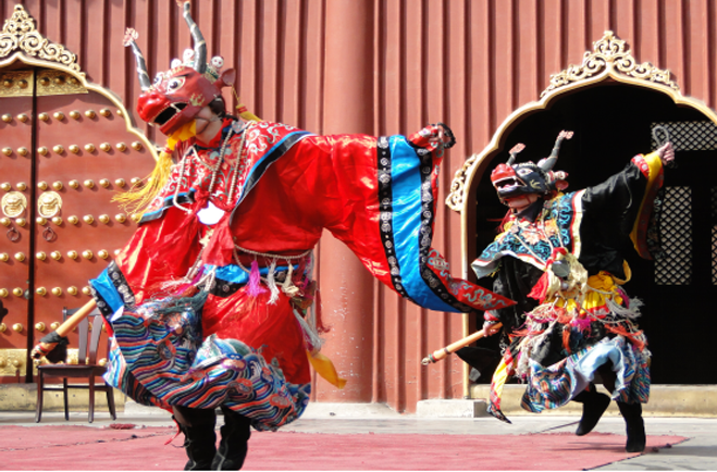 “查瑪”為蒙古語,是藏語“羌姆”的音譯,專業(yè)術(shù)語稱為“金剛驅(qū)魔法舞”。查瑪是藏傳佛教樂舞,具有深刻的教義寓意。蒙古地區(qū)流傳的查瑪舞來源于藏傳佛教羌姆樂舞。它是藏傳佛教的一種密乘宗教舞蹈。查瑪樂舞通過穿戴藏傳佛教中神靈和鬼怪的面具和衣物、手持法器,在法器的伴奏下飾者作出富含藏傳佛教內(nèi)涵的動(dòng)作,以示驅(qū)魔逐祟、祈求吉祥。