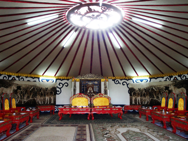 早先,蒙古人逐水草遷移,以氈帳為居室,所以蒙古人對(duì)制作氈帳有很高的技術(shù)。當(dāng)?shù)啬撩竦臍謳び冒酌珰指采w,毛氈上面涂以石灰或白粘土和骨粉,使之更為潔白,有時(shí)也把毛氈涂成黑色。覆蓋在天窗周圍的毛氈,飾以各種圖案,門(mén)口懸掛著繡有各種顏色圖案的毛氈。大汗及諸王的氈帳則涂上金色,舉行宴會(huì)的氈帳可容納2000人。金帳之稱謂也由此而來(lái)【老鐵供圖】。