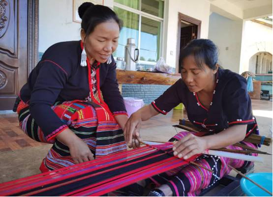 西盟縣翁嘎科鎮(zhèn)班弄村農(nóng)家院子里,佤族老技藝手工織錦縣級傳承人娜龍正在教徒弟娜藥織布。