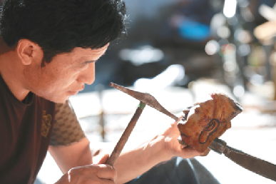 20歲前的次嘎已可以承接一些佛像的鍛敲任務(wù),掌握的技術(shù)遠(yuǎn)遠(yuǎn)超出一起學(xué)習(xí)的其他學(xué)徒們。從鍛敲佛像的蓮花底座、焊接,再到鍛敲銅佛造像上半身、下半身,再到慢慢地開(kāi)始做些佛像飾物。偶爾,次嘎也能涉獵造像的臉部。這是一個(gè)造像師手藝達(dá)到最好時(shí)才可以觸及的部位?!懊娌拷Y(jié)構(gòu)復(fù)雜又微妙,面部表情的刻畫(huà)更是難上加難。作為一個(gè)造像師,這是最考驗(yàn)功力的地方,每一次敲打都在決定作品的成敗。”次嘎說(shuō)道。