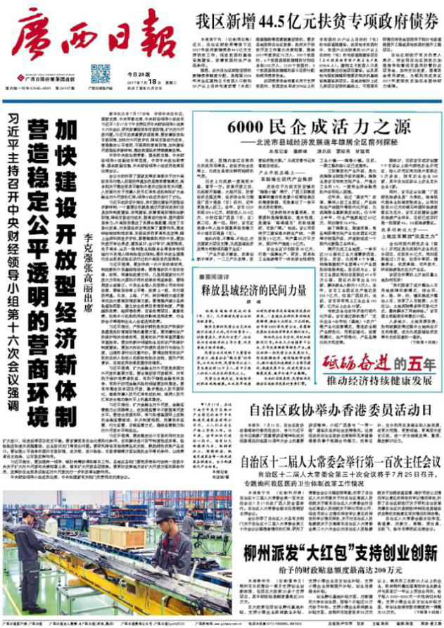 《廣西日報(bào)》立足廣西、面向全國,國內(nèi)外公開發(fā)行。目前,星期一至星期五每日出版對開12版,星期六、星期日出版對開8版,彩色印刷,是廣西第一大綜合性日報(bào)。新聞信息容量大,??笨鄻樱m應(yīng)多層次讀者需要,集指導(dǎo)性、權(quán)威性、科學(xué)性、服務(wù)性、實(shí)用性、知識性和趣味性為一體。