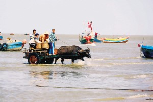 疍家漁民在海上用牛車運送漁獲漁具(2013年攝)。