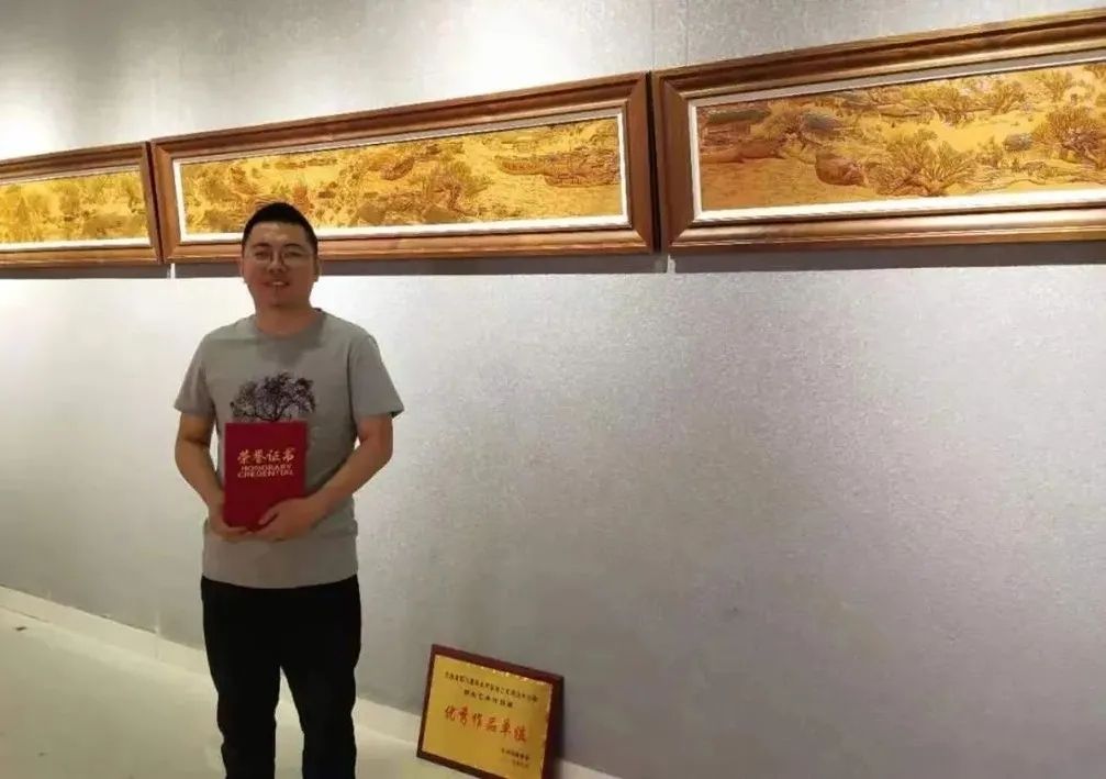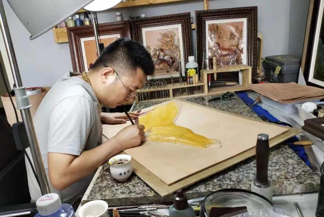包頭市東河區(qū)皮雕畫非遺項目傳承人張衛(wèi)祥,2012年畢業(yè)于中央美術(shù)學院,受老師影響,畢業(yè)后一直致力于把皮雕與古代山水畫結(jié)合,使皮雕畫展現(xiàn)出古樸典雅的風格,許多皮雕作品屢屢獲獎。