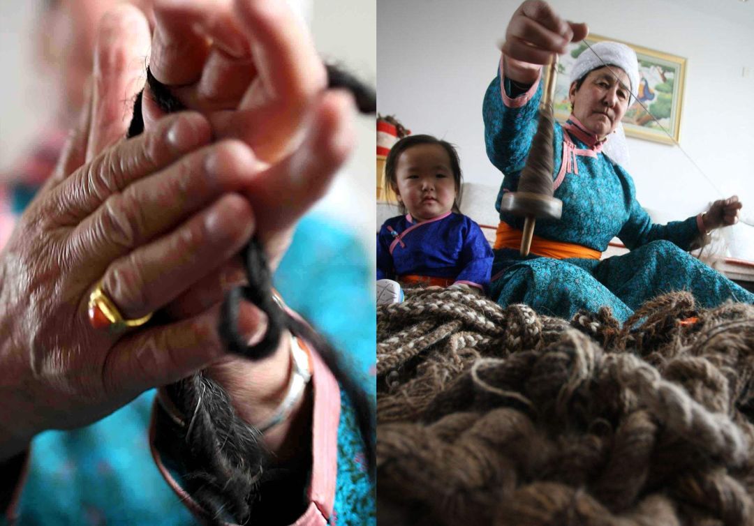 傳統(tǒng)氈繡不僅用于工藝品,大多用在生產(chǎn)生活中。蘇尼特氈繡技藝的繡制首先從制氈開(kāi)始,大都在夏末秋初進(jìn)行。材料多為駝絨線,而紡駝絨線則是用駱駝膝蓋絨毛以及駝鬣的細(xì)絨手搓而成。